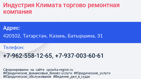 Индустрия Климата, торгово-ремонтная компания по адресу 420102, Татарстан, Казань, Батыршина, 31 в дальнейшем Организация, размещена в следующих категориях: