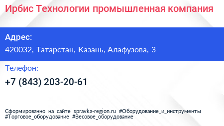 Ирбис Технологии, промышленная компания по адресу 420032, Татарстан, Казань, Алафузова, 3 в дальнейшем Организация, размещена в следующих категориях: