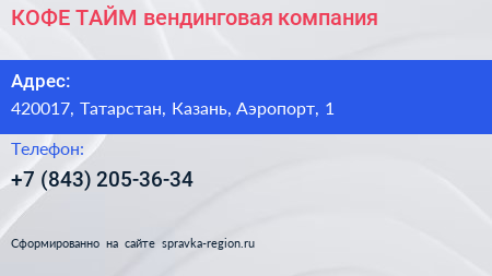 КОФЕ-ТАЙМ, вендинговая компания по адресу 420017, Татарстан, Казань, Аэропорт, 1 в дальнейшем Организация, размещена в следующих категориях: