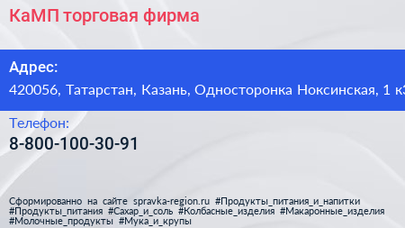 КаМП, торговая фирма по адресу 420056, Татарстан, Казань, Односторонка Ноксинская, 1 к3 в дальнейшем Организация, размещена в следующих категориях: