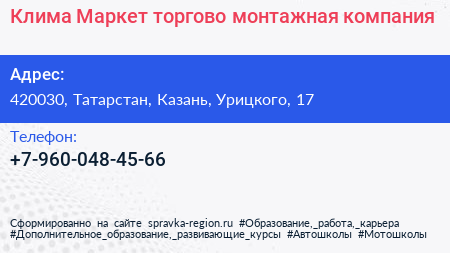 Клима-Маркет, торгово-монтажная компания по адресу 420030, Татарстан, Казань, Урицкого, 17 в дальнейшем Организация, размещена в следующих категориях: