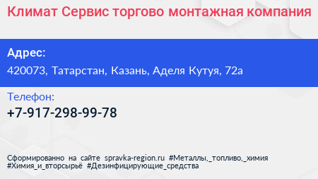 Климат Сервис, торгово-монтажная компания по адресу 420073, Татарстан, Казань, Аделя Кутуя, 72а в дальнейшем Организация, размещена в следующих категориях: