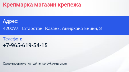 Крепмарка, магазин крепежа по адресу 420097, Татарстан, Казань, Амирхана Еники, 3 в дальнейшем Организация, размещена в следующих категориях: