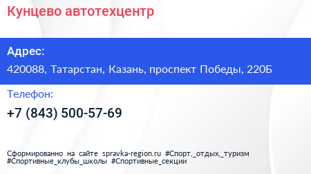 Кунцево, автотехцентр по адресу 420088, Татарстан, Казань, проспект Победы, 220Б в дальнейшем Организация, размещена в следующих категориях: