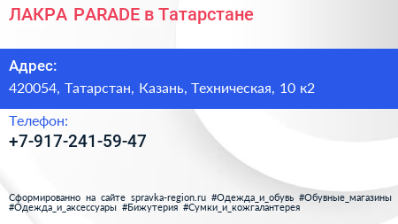 ЛАКРА-PARADE в Татарстане по адресу 420054, Татарстан, Казань, Техническая, 10 к2 в дальнейшем Организация, размещена в следующих категориях: