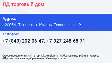 ЛД, торговый дом по адресу 420054, Татарстан, Казань, Техническая, 9 в дальнейшем Организация, размещена в следующих категориях: