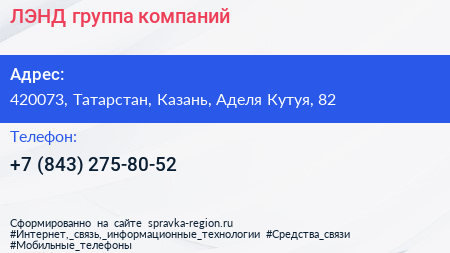 ЛЭНД, группа компаний по адресу 420073, Татарстан, Казань, Аделя Кутуя, 82 в дальнейшем Организация, размещена в следующих категориях: