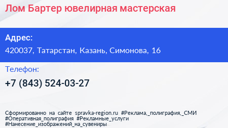 Лом-Бартер, ювелирная мастерская по адресу 420037, Татарстан, Казань, Симонова, 16 в дальнейшем Организация, размещена в следующих категориях: