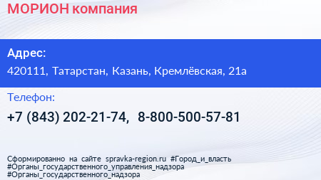 МОРИОН, компания по адресу 420111, Татарстан, Казань, Кремлёвская, 21а в дальнейшем Организация, размещена в следующих категориях: