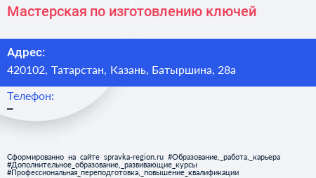 Мастерская по изготовлению ключей по адресу 420102, Татарстан, Казань, Батыршина, 28а в дальнейшем Организация, размещена в следующих категориях: