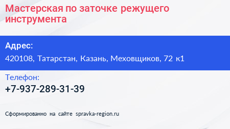 Мастерская по заточке режущего инструмента по адресу 420108, Татарстан, Казань, Меховщиков, 72 к1 в дальнейшем Организация, размещена в следующих категориях: