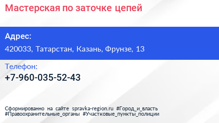 Мастерская по заточке цепей по адресу 420033, Татарстан, Казань, Фрунзе, 13 в дальнейшем Организация, размещена в следующих категориях:
