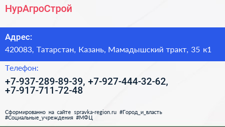 НурАгроСтрой по адресу 420083, Татарстан, Казань, Мамадышский тракт, 35 к1 в дальнейшем Организация, размещена в следующих категориях: