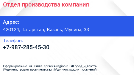 Отдел производства, компания по адресу 420124, Татарстан, Казань, Мусина, 33 в дальнейшем Организация, размещена в следующих категориях: