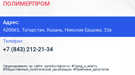 ПОЛИМЕРПРОМ по адресу 420061, Татарстан, Казань, Николая Ершова, 31в в дальнейшем Организация, размещена в следующих категориях: