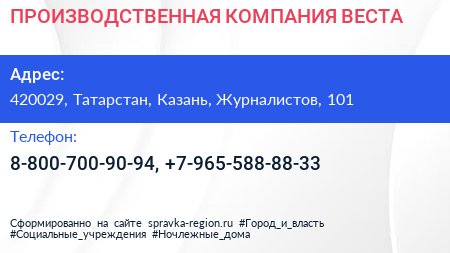 ПРОИЗВОДСТВЕННАЯ КОМПАНИЯ ВЕСТА по адресу 420029, Татарстан, Казань, Журналистов, 101 в дальнейшем Организация, размещена в следующих категориях: