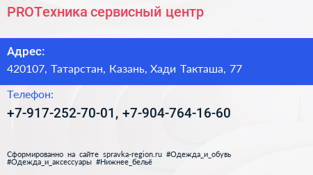 PROТехника, сервисный центр по адресу 420107, Татарстан, Казань, Хади Такташа, 77 в дальнейшем Организация, размещена в следующих категориях: