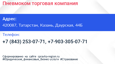 Пневмоком, торговая компания по адресу 420087, Татарстан, Казань, Даурская, 44Б в дальнейшем Организация, размещена в следующих категориях: