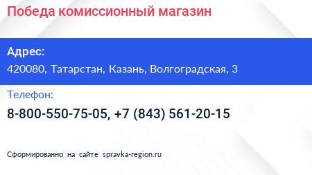Победа, комиссионный магазин по адресу 420080, Татарстан, Казань, Волгоградская, 3 в дальнейшем Организация, размещена в следующих категориях: