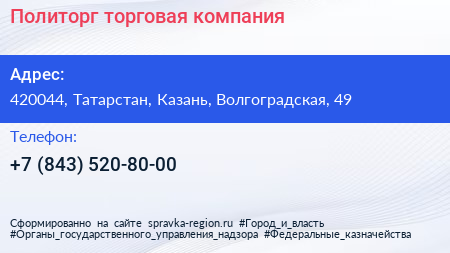 Политорг, торговая компания по адресу 420044, Татарстан, Казань, Волгоградская, 49 в дальнейшем Организация, размещена в следующих категориях:
