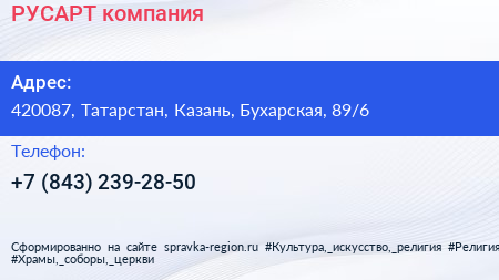 РУСАРТ, компания по адресу 420087, Татарстан, Казань, Бухарская, 89/6 в дальнейшем Организация, размещена в следующих категориях: