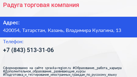 Радуга, торговая компания по адресу 420054, Татарстан, Казань, Владимира Кулагина, 13 в дальнейшем Организация, размещена в следующих категориях: