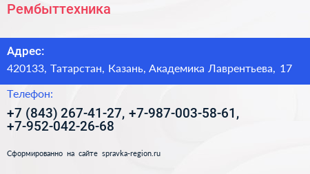Рембыттехника по адресу 420133, Татарстан, Казань, Академика Лаврентьева, 17 в дальнейшем Организация, размещена в следующих категориях:
