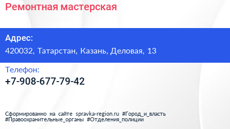 Ремонтная мастерская по адресу 420032, Татарстан, Казань, Деловая, 13 в дальнейшем Организация, размещена в следующих категориях: