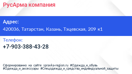 РусАрма, компания по адресу 420036, Татарстан, Казань, Тэцевская, 209 к1 в дальнейшем Организация, размещена в следующих категориях: