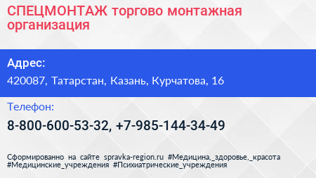 СПЕЦМОНТАЖ, торгово-монтажная организация по адресу 420087, Татарстан, Казань, Курчатова, 16 в дальнейшем Организация, размещена в следующих категориях: