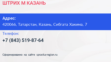 ШТРИХ-М КАЗАНЬ по адресу 420066, Татарстан, Казань, Сибгата Хакима, 7 в дальнейшем Организация, размещена в следующих категориях: