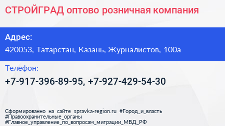 СТРОЙГРАД, оптово-розничная компания по адресу 420053, Татарстан, Казань, Журналистов, 100а в дальнейшем Организация, размещена в следующих категориях: