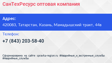 СанТехРесурс, оптовая компания по адресу 420083, Татарстан, Казань, Мамадышский тракт, 44в в дальнейшем Организация, размещена в следующих категориях: