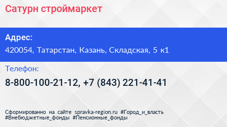 Сатурн, строймаркет по адресу 420054, Татарстан, Казань, Складская, 5 к1 в дальнейшем Организация, размещена в следующих категориях: