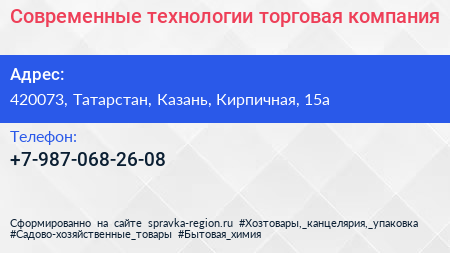 Современные технологии, торговая компания по адресу 420073, Татарстан, Казань, Кирпичная, 15а в дальнейшем Организация, размещена в следующих категориях: