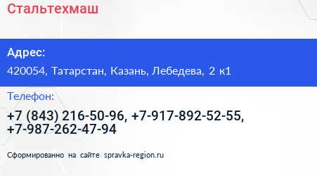Стальтехмаш по адресу 420054, Татарстан, Казань, Лебедева, 2 к1 в дальнейшем Организация, размещена в следующих категориях: