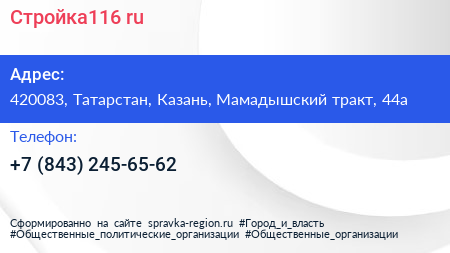 Стройка116.ru по адресу 420083, Татарстан, Казань, Мамадышский тракт, 44а в дальнейшем Организация, размещена в следующих категориях: