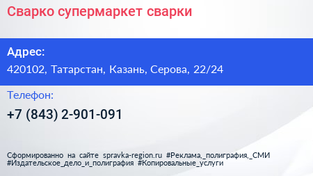 Сварко, супермаркет сварки по адресу 420102, Татарстан, Казань, Серова, 22/24 в дальнейшем Организация, размещена в следующих категориях: