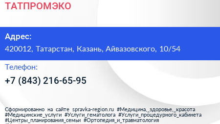 ТАТПРОМЭКО по адресу 420012, Татарстан, Казань, Айвазовского, 10/54 в дальнейшем Организация, размещена в следующих категориях: