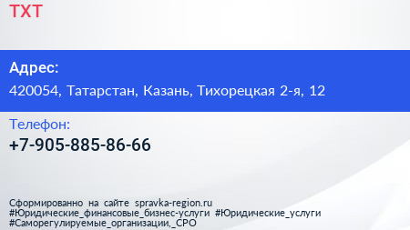 ТХТ по адресу 420054, Татарстан, Казань, Тихорецкая 2-я, 12 в дальнейшем Организация, размещена в следующих категориях: