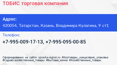 ТОБИС, торговая компания по адресу 420054, Татарстан, Казань, Владимира Кулагина, 9 ст1 в дальнейшем Организация, размещена в следующих категориях: