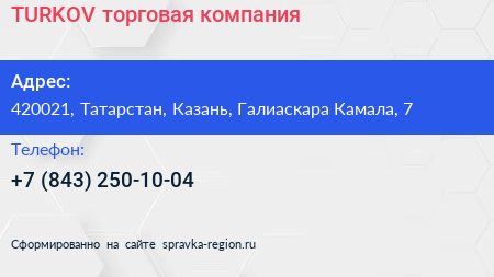 TURKOV, торговая компания по адресу 420021, Татарстан, Казань, Галиаскара Камала, 7 в дальнейшем Организация, размещена в следующих категориях: