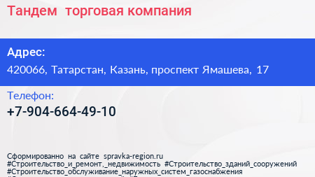 Тандем+, торговая компания по адресу 420066, Татарстан, Казань, проспект Ямашева, 17 в дальнейшем Организация, размещена в следующих категориях: