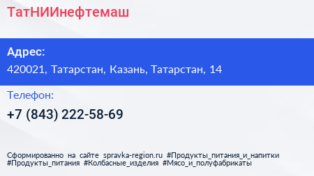 ТатНИИнефтемаш по адресу 420021, Татарстан, Казань, Татарстан, 14 в дальнейшем Организация, размещена в следующих категориях:
