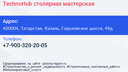 TechnoHub, столярная мастерская по адресу 420004, Татарстан, Казань, Горьковское шоссе, 49д в дальнейшем Организация, размещена в следующих категориях: