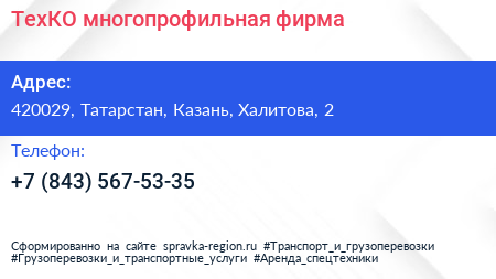 ТехКО, многопрофильная фирма по адресу 420029, Татарстан, Казань, Халитова, 2 в дальнейшем Организация, размещена в следующих категориях: