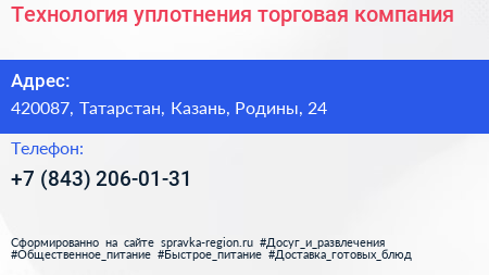 Технология уплотнения, торговая компания по адресу 420087, Татарстан, Казань, Родины, 24 в дальнейшем Организация, размещена в следующих категориях: