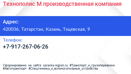 Технополис-М, производственная компания по адресу 420036, Татарстан, Казань, Тэцевская, 9 в дальнейшем Организация, размещена в следующих категориях: