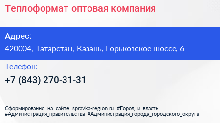 Теплоформат, оптовая компания по адресу 420004, Татарстан, Казань, Горьковское шоссе, 6 в дальнейшем Организация, размещена в следующих категориях: