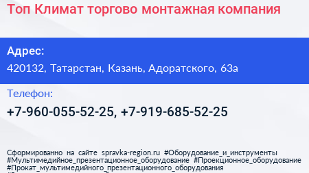 Топ Климат, торгово-монтажная компания по адресу 420132, Татарстан, Казань, Адоратского, 63а в дальнейшем Организация, размещена в следующих категориях: